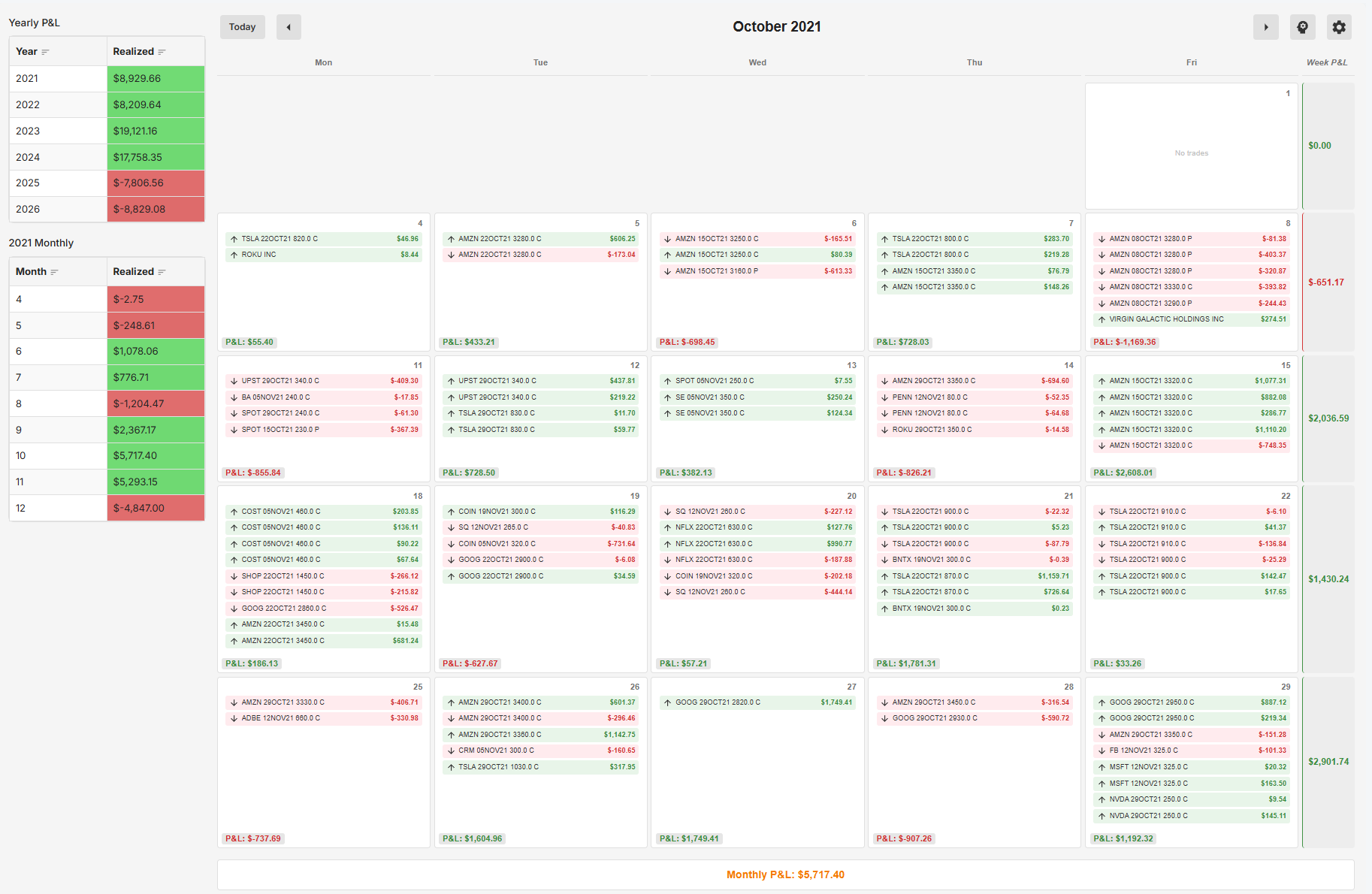 Kalendarz P&L to najlepsze narzędzie do wizualnego sprawdzania konsystencji. Zobacz swoje postępy na pierwszy rzut oka w różnych przedziałach czasowych. Interaktywny interfejs pozwala na zagłębienie się od podsumowań miesięcznych do pojedynczych sesji, ułatwiając dostrzeżenie, czy Twoje zyski koncentrują się w określonych dniach miesiąca lub tygodnia.